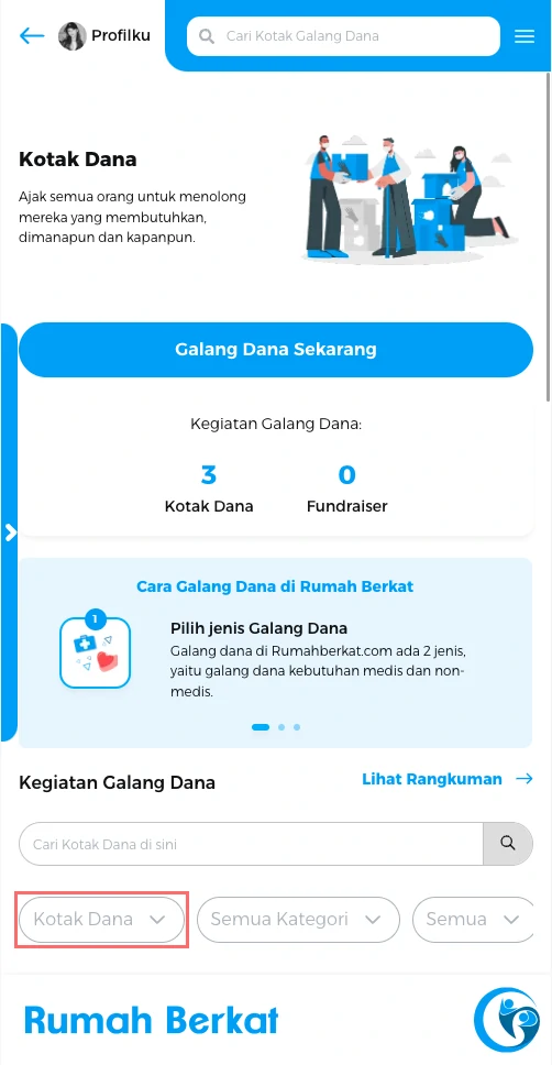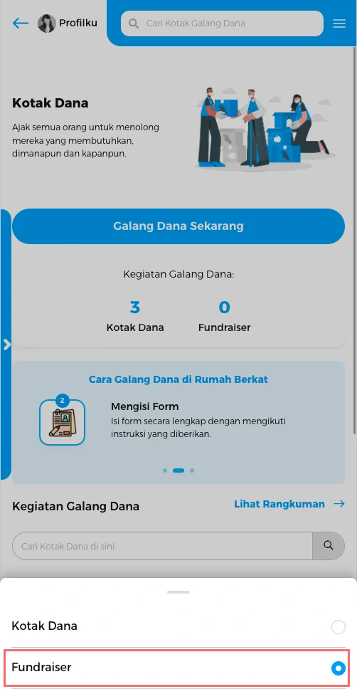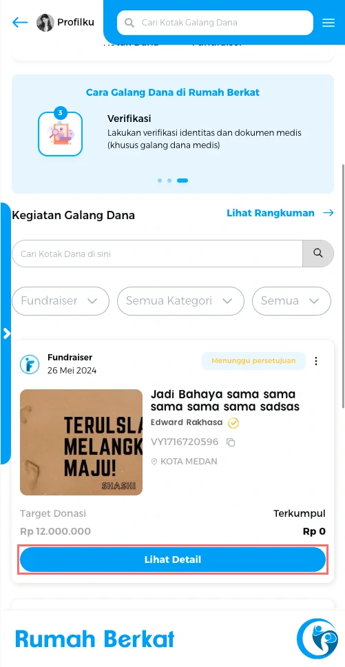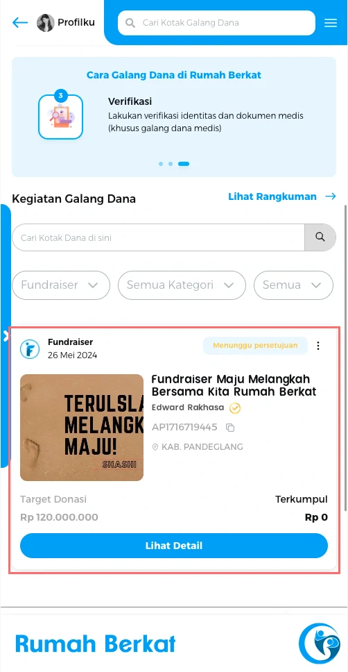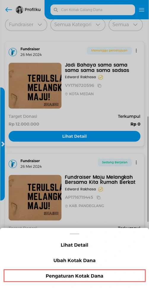 Anda dapat melihat list kotak dana fundraiser anda.