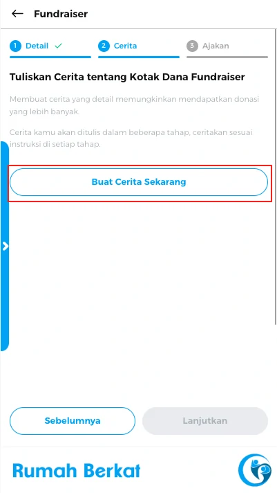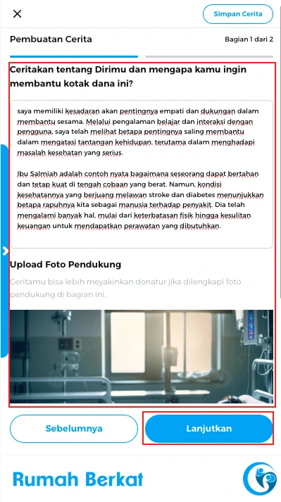 Pada pembuatan cerita bagian 1, tuliskan mengenai dirimu dan mengapa kamu ingin membantu kotak dana ini, lalu upload foto pendukung, klik tombol “lanjutkan”