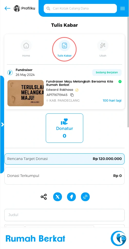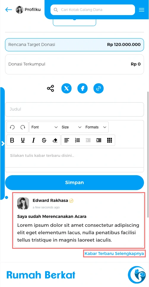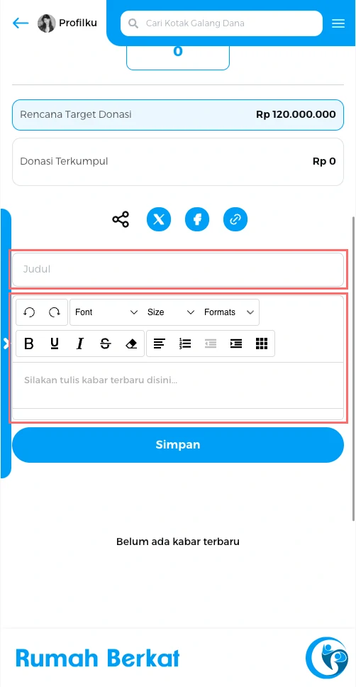 Isi judul dan informasi untuk kabar terbaru mengenai kondisi atau keadaan yang berhubungan dengan cerita kotak dana, kemudian klik “simpan”