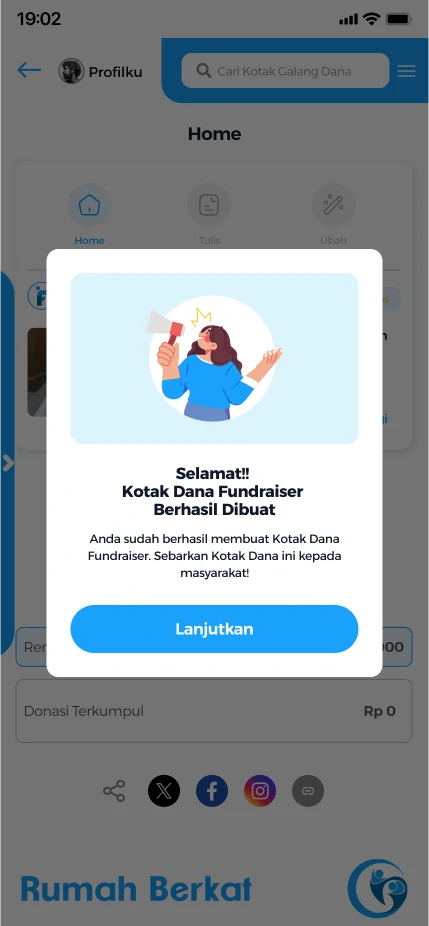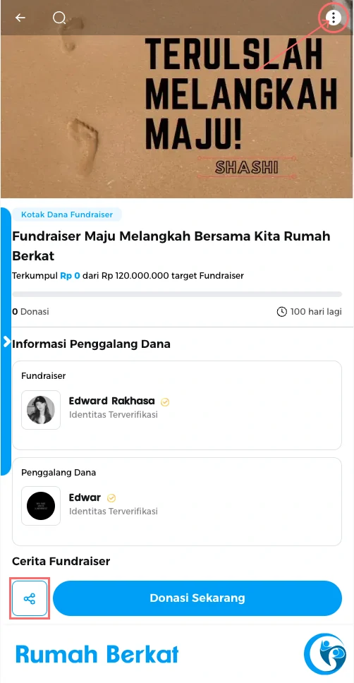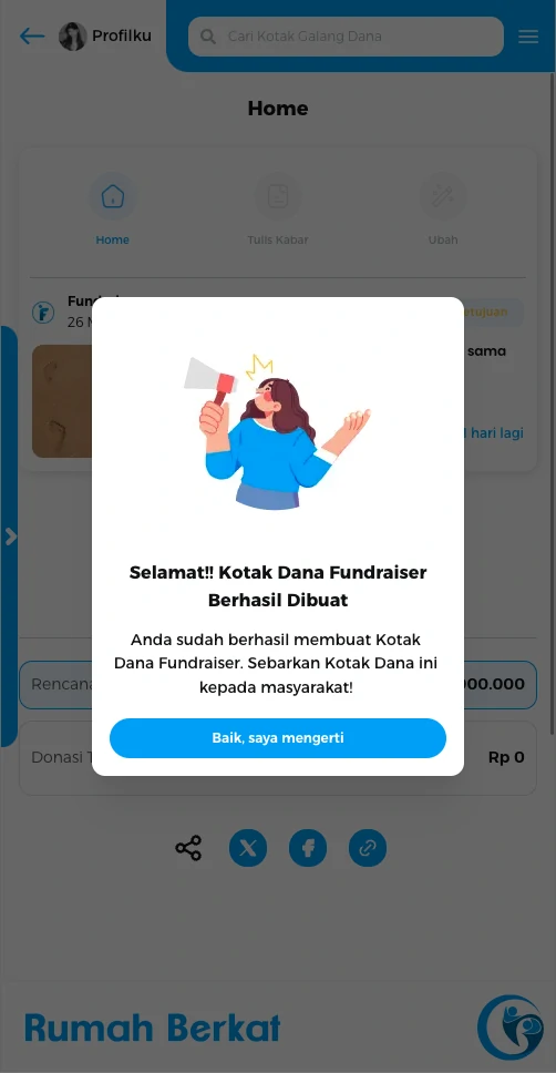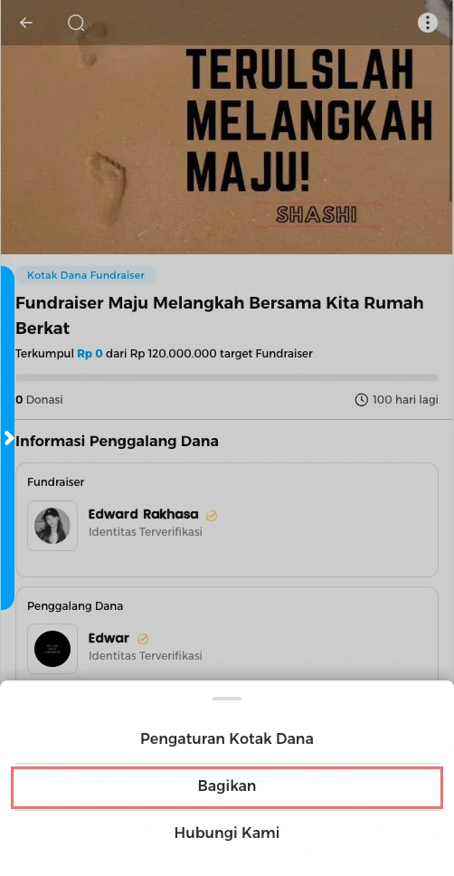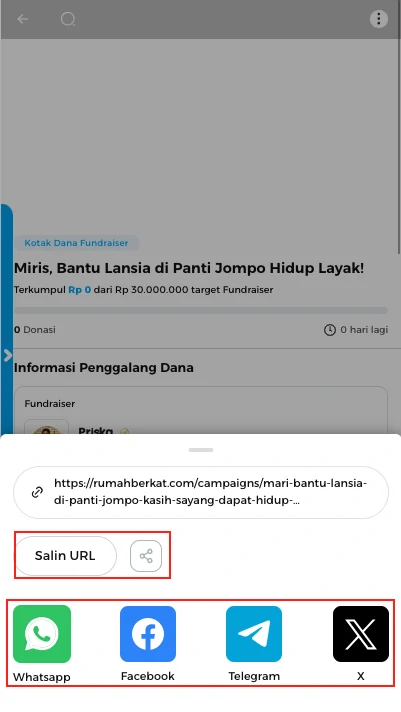 Silahkan pilih opsi “salin URL” atau klik ikon media sosial untuk membagikan tautan kotak dana fundraiser.