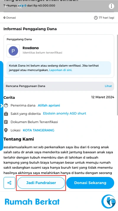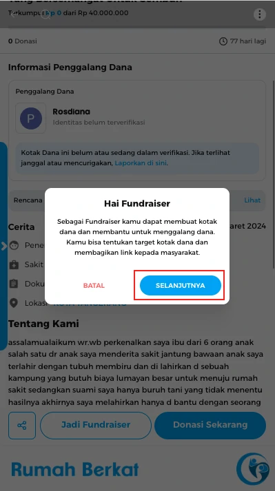 Muncul pop up keterangan fundraiser, klik tombol “selanjutnya