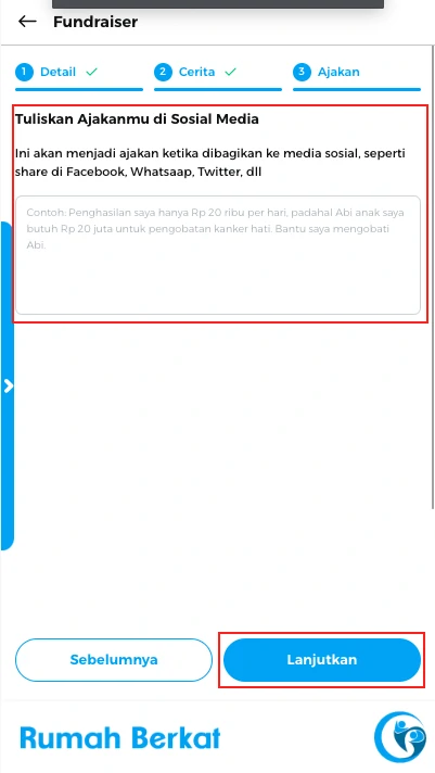 Pada langkah ketiga, tuliskan ajakanmu di sosial media, kemudian klik tombol “lanjutkan”