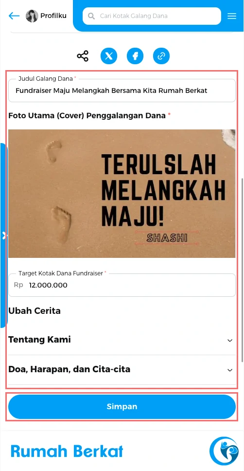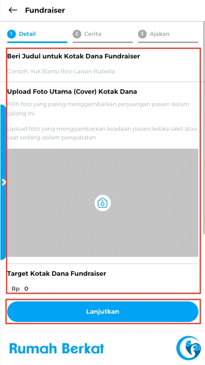 Pada langkah pertama, lengkapi kotak dana anda dapat mengganti judul, foto utama, dan target kotak dana.