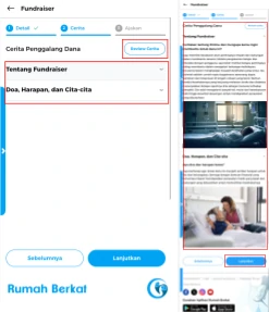 Tinjau kembali cerita pada halaman ringkasan penggalangan, jika sudah sesuai, centang syarat & ketentuan kemudian klik tombol “lanjutkan”