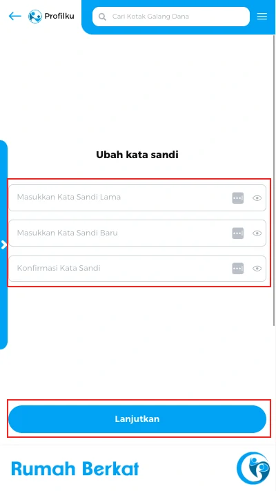Masukkan kata sandi saat ini dan isi kata sandi baru dan konfirmasi kata sandi,, klik tombol “lanjutkan”