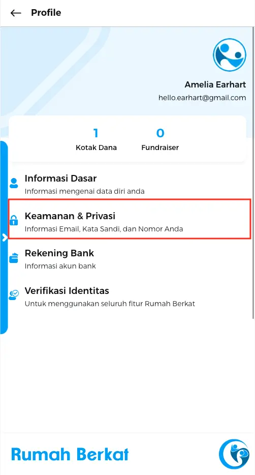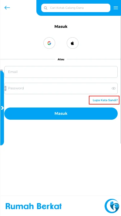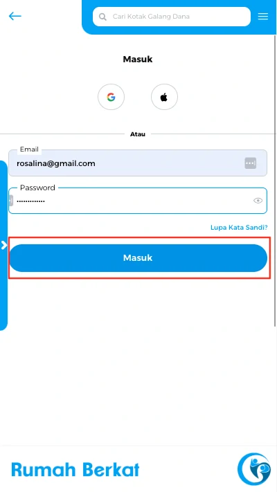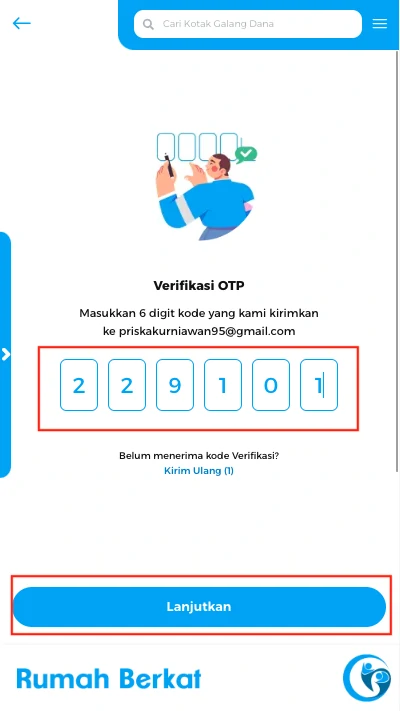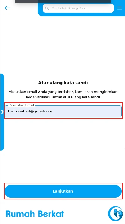 Masukkan email anda yang terdaftar di rumah berkat, klik tombol “lanjutkan”