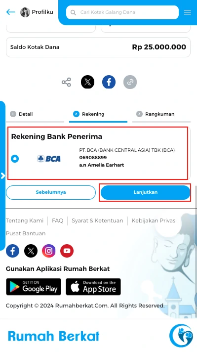 Pilih rekening bank penerima dana, lalu klik “lanjutkan”
