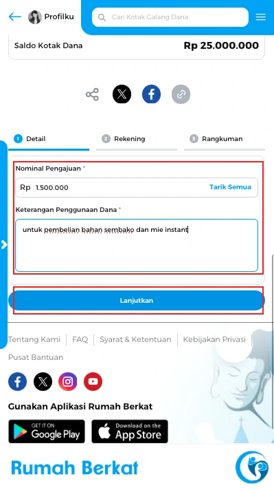 Isi nominal pencairan dana dan keterangan penggunaan dana, kemudian klik “lanjutkan”