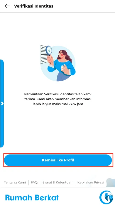 Verifikasi Identitas anda sedang dalam proses validasi oleh admin, klik tombol “kembali ke profil”