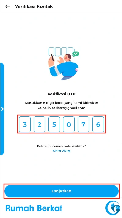 Masukkan 6 digit angka kode OTP yang dikirimkan ke email anda, kemudian klik “lanjutkan”